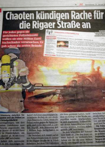 Berlin, 13th January: Five hundred cops storm a house in Rigaer street in the district Friedrichshain. According to the people who live there, later 8 other houses in the area were also searched. Friedrichshain is a dangerous district. For some time now snatch squads have been chasing suspects in the streets at night. A permanent heads-up for this district in which still and again some troublemakers are living.
