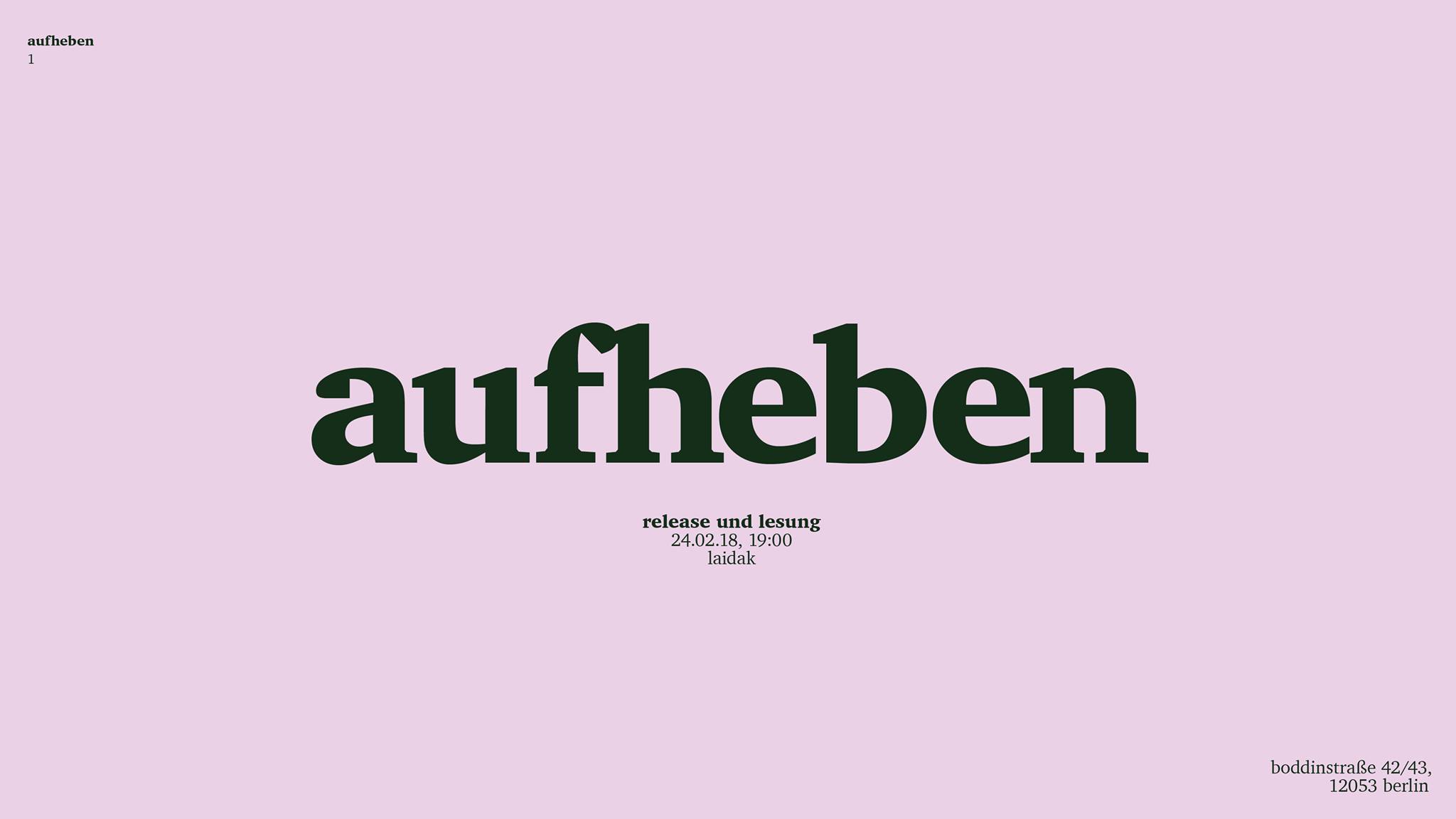 Wir laden euch ein zur Vorstellung der ersten Nummer der Zeitschrift „aufheben“. Das kann viel bedeuten — und wenig heißen — oder vielleicht doch? In jedem Fall gibt es Lesungen, Bilder, Musik. Die Texte sind in Zugabteilen, bei Tischtennisplatten, vor Notaufnahmen, in der Staatsbibliothek, Mecklenburg oder Athen angesiedelt. Alle Gattungen werden abgedeckt. Es geht um Jesus, die DDR, Schlucken-Müssen in virtuellen Labyrinthen und Pflanzen hinter Fenstern. Das hat alles damit zu tun, dass es keinem Menschen reicht Müll zu sammeln, ausgebrannte Anzugsträger zu wählen, Medaillen zu zählen oder sich einmal im Jahr besaufen zu dürfen um die andern Tage zu vergessen. Geschrieben wird, weil man sich etwas anders vorstellen kann und sich das trotzdem alles anschauen muss.