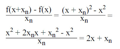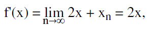 Statt einer mystischen infinitesimalen Größe dx führen wir ein neues dynamisches Objekt ein: eine Folge xn, wobei n ein fortlaufender Index, so daß die Folge aus den Zahlen x1, x2, x3, … besteht. Z.B. 1, 2, 3, 4… wäre eine solche triviale Folge. Aber hier besser: 1, ½, ¼, 1/8, … Diese Folge nämlich verschwindet, bzw. wird Null, wenn man sich n ins Unendliche umgeschlagen denkt, so daß sie für unseren Fall taugt. Nun erscheint die vorläufige Ableitung wie folgt: