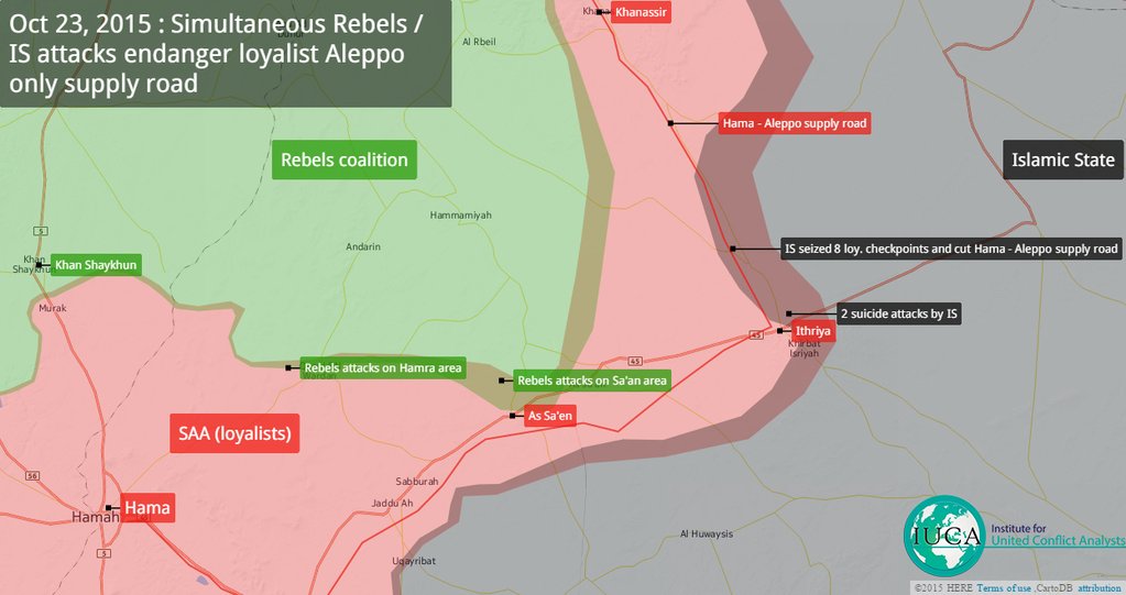 Die Offensive läuft buchstäblich an allen Fronten. Wer sich einen heroischen Überblick verschaffen will, sei auf die freie russische Propagandaagentur South Front verwiesen, die wenigstens die Fronten klar darstellt. Sie richtet sich tatsächlich nicht in der Hauptsache gegen den IS. Der IS mag einen großen Flecken der Kriegskarte Grauschwarz einfärben, aber das sind wenig besiedelte Wüstengebiete. Wichtig ist der Westen des Landes und dort insbesondere die Verbindungen von Damaskus, Aleppo und Latakia. Die sind der Grund der Offensiven nördlich von Homs, nördlich von Hama und natürlich rund um Aleppo, denen Osten-Sacken seine Fallbeispiele entnahm. Bei Aleppo wird scheinbar nicht versucht, diese Stadt selbst wieder vollständig einzunehmen. Vielmehr konzentrieren sich die Kräfte zunächst auf die Verbindungsroute nach Latakia und Damaskus. Man versucht passend dazu auch, von Latakia aus in Richtung Aleppo vor zu stoßen. Ferner gibt es Offensiven in Ghouta bei Damaskus und an der Südfront. Das sind alles Kämpfe der Truppen Assads gegen den bunten Mix der untereinander sowohl zerstrittenen wie in permanent wechselnden Allianzen kämpfenden syrischen Rebellen, meist abzüglich dem IS, aber inklusive der Nusra-Front und Ahrar ash-Sham. Es gibt dabei militärisch keinen Sinn, zwischen FSA-Verbänden und radikaleren islamistischen Verbänden zu unterscheiden. Und es tun das weder Osten-Sacken noch die zahlreichen Kriegskarten dieser Region, auf denen die Rebellengebiete mit derselben Farbe gefärbt sind und nur der abtrünnige IS eine eigene bekommt. Inzwischen deutet sich aber auch eine Versöhnung mit dem Islamischen Staat an, der parallel mit anderen Rebellenverbänden die durch die Wüste improvisierten Nachschublinien der Kräfte Assads nach Aleppo angreift. Die relative Aussparung des IS liegt dabei hauptsächlich an den relativ unbedeutenden Gebieten, die in Syrien vom IS kontrolliert werden. Ferner mögen auch Überlegungen eine Rolle spielen, nach denen die anderen islamistischen Kräfte gefährlicher für die Zentralgewalt Syriens sind, da sie stärkere und offenere Unterstützung durch diverse ausländische Mächte erhalten, während der IS weitgehend isoliert ist und insbesondere die USA gegen sich hat. Das alles ist jedenfalls korrekte militärische Strategie und nicht Teil eines von Osten-Sacken unterstellten besonders perfiden Plans. Es stimmt auch nicht, dass der IS gar nicht Ziel der neuen Offensive wäre. Gegen den IS gibt es eine Offensive nordwestlich von Aleppo. Außerdem versucht die irakische Armee eine Übereinkunft mit Russland zu erreichen, damit sie ihrerseits gegen den IS in die Offensive kommt. Das wird aber bislang von den USA verhindert. Die USA wiederum scheint ihre Angriffe auf den IS zu verschärfen und man kann im Grunde davon sprechen, dass die Luftwaffen Russlands und der USA sich die Arbeit teilen. Soweit einige Impressionen des gegenwärtigen Frontverlaufs.